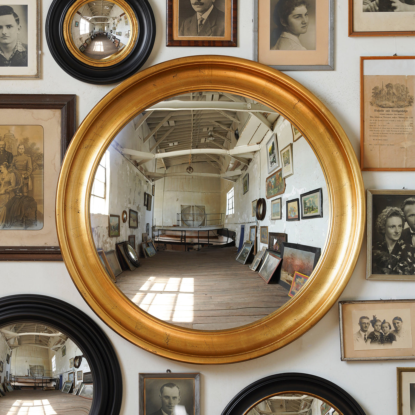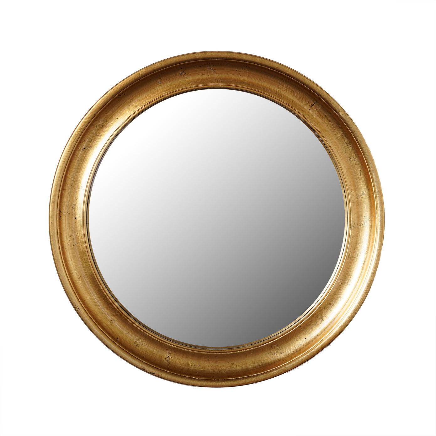 The Beveled Gold Mirror is a round, golden-hued classic. Made of solid wood, the Beveled Gold Mirror is fashioned in the style of old crown molding so that it emboldens a room with its clean, beveled lines.