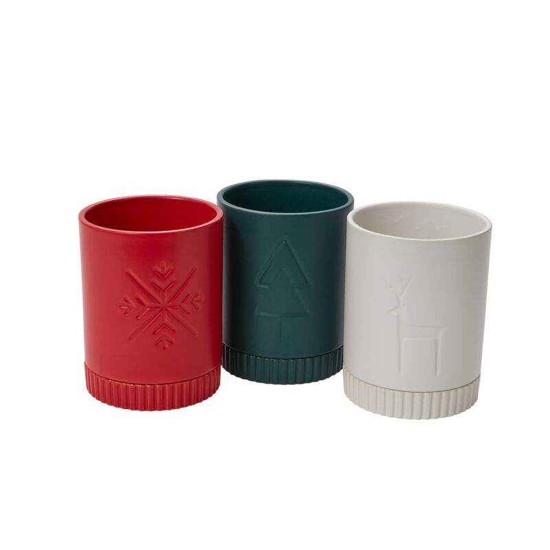 The modern simplicity of this pot captures the essence of a Hygge styled holiday. A unique Christmas decoration, the pot is a minimalist cylinder with a holiday design and matte finish, that rests on a ribbed saucer.